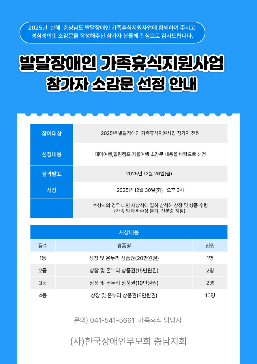 2025년 발달장애인 가족휴식지원사업 참여자 소감문 선정 안내