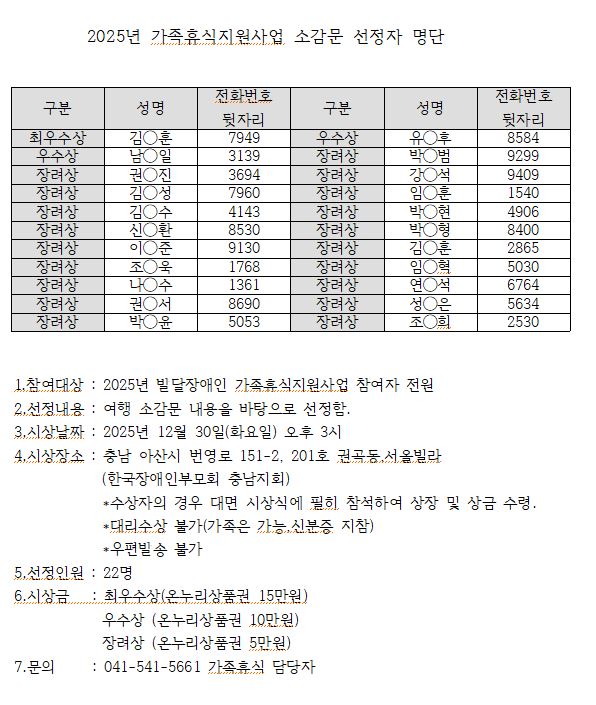 2025년 가족휴식지원사업 소감문 선정자 명단
